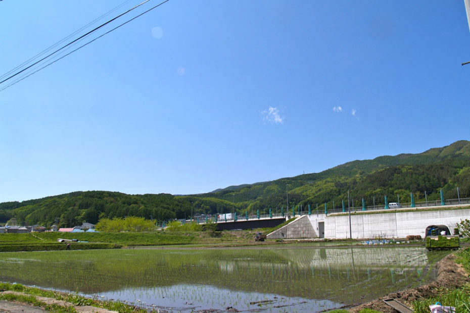 5月の晴天の中、事務所前でもお田植えがおこなわれていました。前方に見える道路が坂室バイパスです。