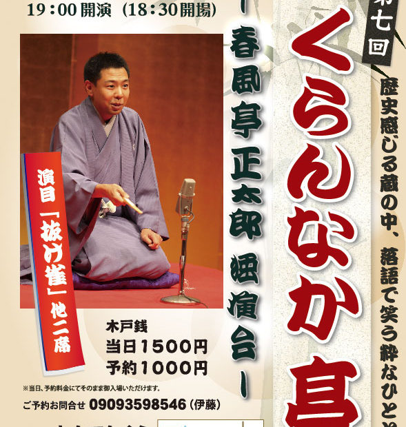 春風亭正太郎独演会「第七回くらんなか亭」が宮川かんてんぐらにて開催されます。