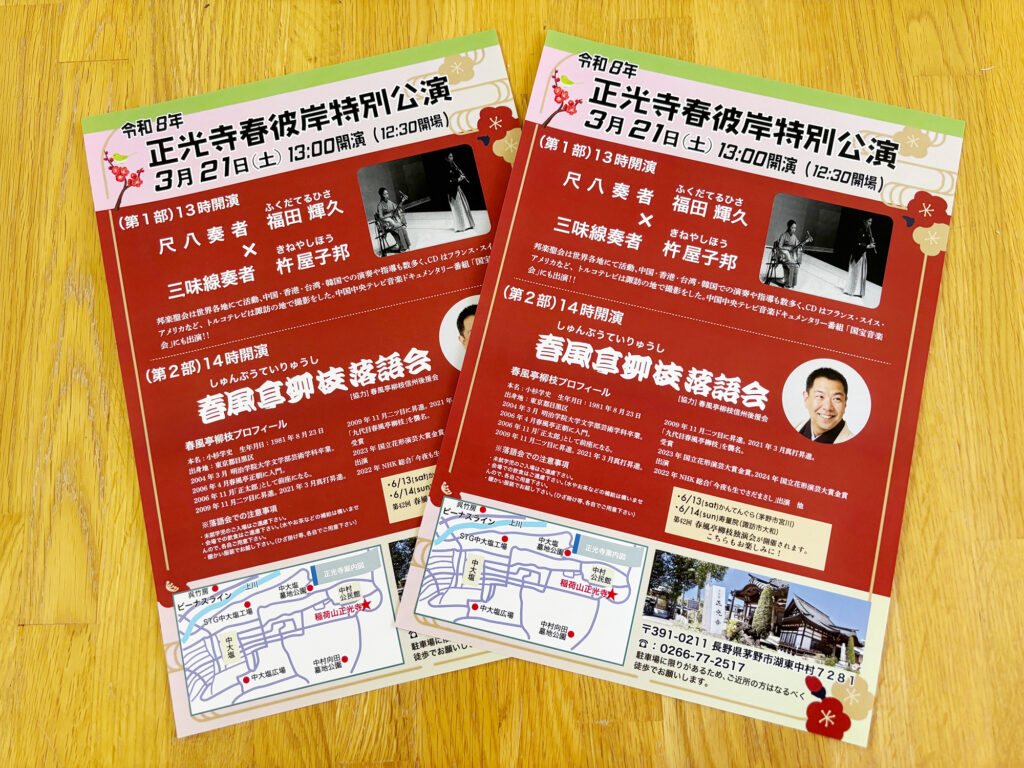 正光寺「春彼岸特別公演」チラシ・ポスターができました。2026.2.21お知らせ 正光寺「春彼岸特別公演」チラシ・ポスターができました。 共有: Facebook で共有するにはクリックしてください (新しいウィンドウで開きます) Facebook クリックして X で共有 (新しいウィンドウで開きます) X いいね:いいね 読み込み中…previousYumi Music Studio様の立体パネルができました。